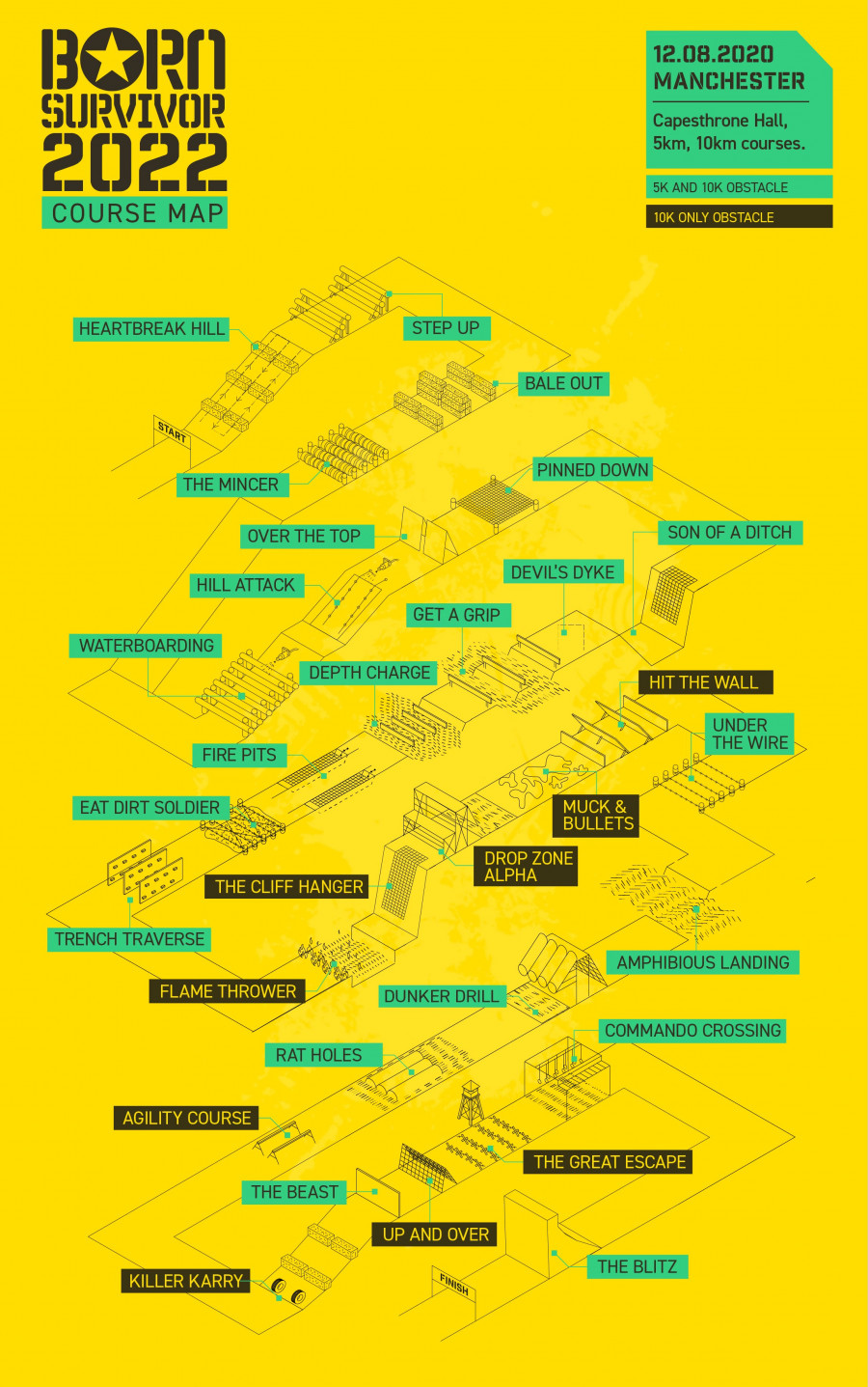 - Born Survivor is guaranteed to take you on the ultimate adventure as you negotiate breath taking slides, cold water obstacles, climbing nets, underground tunnels such as The Great Escape, climbing walls along with other Top Secret Obstacles, not forgetting our infamous Big Wall Finisher THE BLITZ and the fastest and longest obstacle course slide in the world THE TORPEDO!